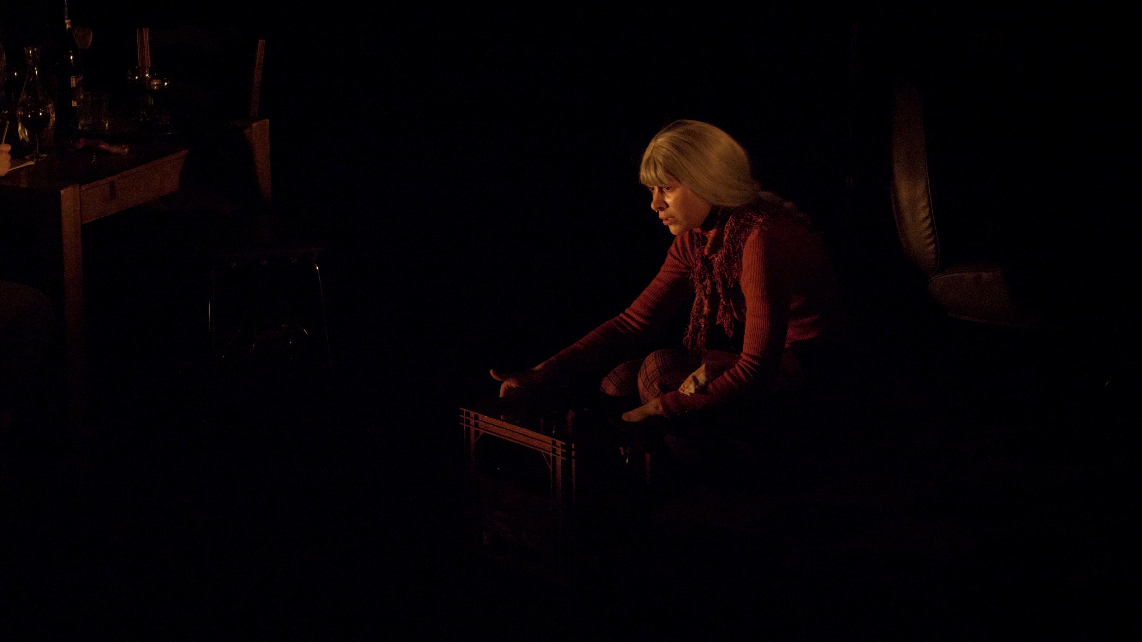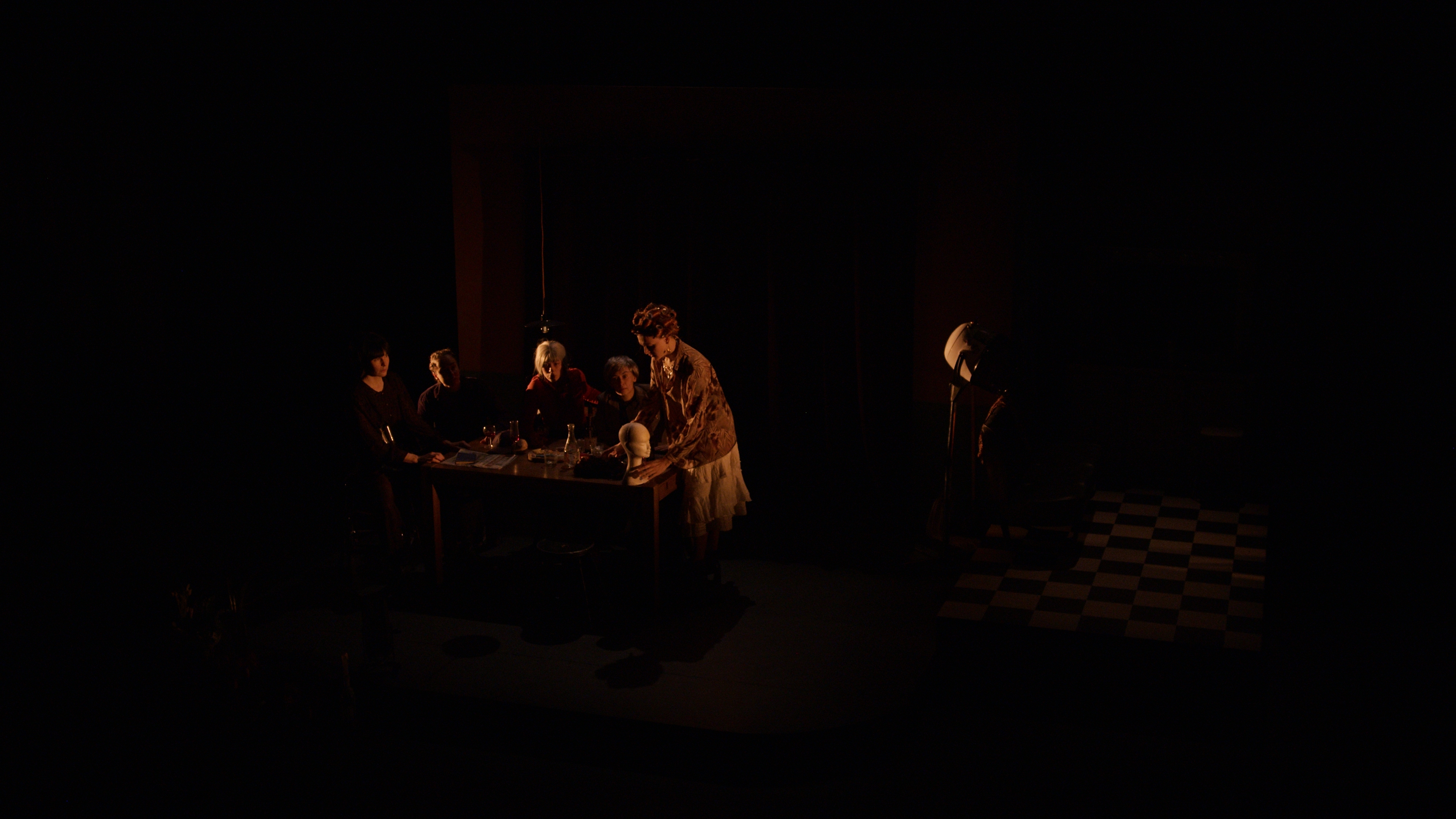 L’espace de jeu est un lieu de résistance, un lieu fragile et subversif, à l’image de l’esthétique viscérale de Nadège Prugnard. Un espace hybride, saturé d’objets recyclés et détournés, où chaque élément se réinvente pour acquérir de nouvelles fonctions. Tour à tour, cet espace devient salon de coiffure, théâtre bricolé, lieu de convivialité incertain, ou bien terrain de lutte contre la disparition. C’est un lieu qui ne choisit pas, qui se refuse à figer sa fonction, un espace en perpétuelle transformation. La terre, répandue progressivement sur le plateau par les personnages, joue un rôle central. Elle n’est pas qu’une matière inerte, elle est mémoire, trace tangible des luttes passées et présentes. Dans une forme presque ritualisée, elle dessine un passage secret, un seuil vers un autre monde. Cet autre monde, c’est celui de la Musicienne, derrière le large rideau de velours qui recouvre le mur du lointain. Dos au public, entourée de ses instruments, elle crée la symphonie du monde invisible. Nous ne verrons jamais son visage. Le temps, dans cet espace, se distord. La marche des personnages devient un motif récurrent, ombres projetées, tremblements des rideaux, silhouettes traversant la scène comme une farandole sans fin. À la mort de Shakespeare, tandis que l’on quitte lentement les lieux, la farandole des ombres continue de vibrer, incarnant à la fois les fantômes et la réinvention d’une campagne qui, malgré tout, refuse de disparaître.